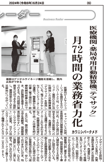 この度、北海道医療新聞に自動精算機テマサックが取り上げられました(^^♪ 「株式会社北海道医療新聞社 北海道医療新聞 2024年6月24日号掲載」